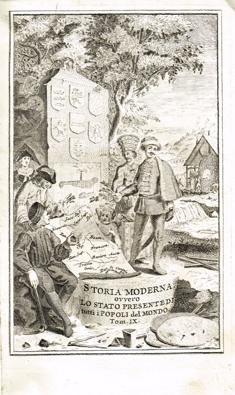 Lo stato presente di tutti i paesi, e popoli del mondo naturale, politico, e morale ... volume IX. Dei regni di Boemia, e di Ungheria, dell'imperio Germanico in generale, ed in particolare dei circoli d'Austria, Baviera, Franconia, Sassonia, superiore ed inferiore. (Storia moderna ovvero tutti i popoli del mondo IX). 2. Aufl. Venedig, G. Albrizzi, 1740. In-8; gestochener Vortitel, Titel, 10 Bll., 479 pp mit einer gestochenen Vignette, 6 gefaltete Kupfertafeln, 7 Faltkarten (von Isak Tirion, Amsterdam); Pergamentband der Zeit mit goldgeprägtem Rückenschildchen (dieses etwas beschädigt, vorderes Innengelenk geplatzt); vor allem die Karten teilweise stock- bzw. wasserfleckig (meist am Rand), einzelne unbedeutende Läsuren.