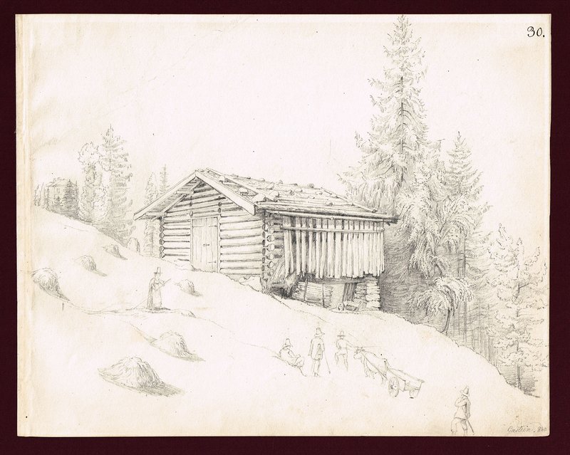 "Gastein. [1]840". Unsignierte Bleistiftzeichnung aus einem Skizzenbuch von Louis Pereira-Arnstein (1803-1858), 20,5 x 25,5 cm. - Almhütte am Waldrand, davor Bauern beim Heueinbringen.
