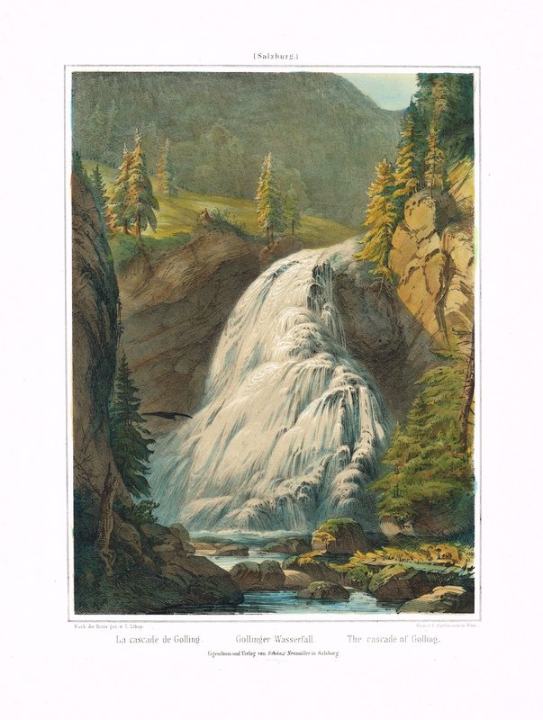 "Gollinger Wasserfall". Altkolorierte Tonlithographie von Karl Ludwig Libay (1814-1888) aus Georg Pezolt, Salzburg und seine Angraenzungen, 1849, 27,5 x 20,5 cm. - Die untere Stufe des malerischen, aus einer Karsthöhle gespeisten Schwarzbachfalls an der Gemeindegrenze zu Kuchl. Mit dreisprachiger Beschriftung. - Ansprechend koloriertes schönes Blatt.