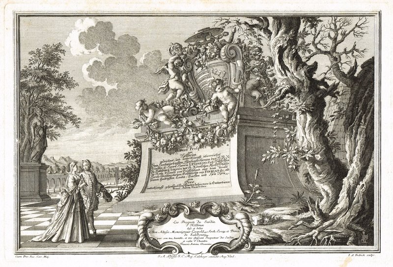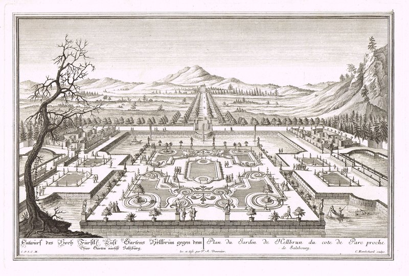 Nebehay-Wagner 131/IV/1-12 (dort ohne das Widmungsblatt und ohne Berücksichtigung der tatsächlichen Blattnummern). - Der Zeichner und Architekt Franz Anton Danreiter (1695-1760) war ab 1728 Aufseher über alle Schlossgärten Salzburgs und gestaltete unter anderem den ursprünglich manieristisch angelegten Garten von Hellbrunn im barocken Geschmack um. Er veröffentlichte mehrere von ihm minutiös gezeichnete Serien mit Salzburger Ansichten.