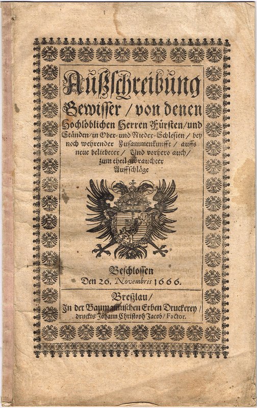 Außschreibung gewisser, von denen Hochlöblichen Herren Fürsten, und Ständen, in Ober- und Nieder-Schlesien, bey noch wehrender Zusammenkunfft, auffs neue beliebeter, Und vorhero auch, zum theil gebrauchter Auffschläge. Beschlossen den 26. Novembris 1666. Breslau, Baumannische Erben, (1666). In-4; Titel mit Wappenholzschnitt und Bordüre, 7 Bll. mit zwei Initialen; Fadenheftung mit Papierrücken (angeschmutzt und etwas knittrig); fleckig und wasserrandig, das letztes Blatt mit Brandloch und kleinen Mängeln im weißen Rand. - Steuer- und Zolledikt verlautbart durch den Breslauer Bischof Sebastian von Rostock (1607-1671) als Oberhauptmann von Schlesien.