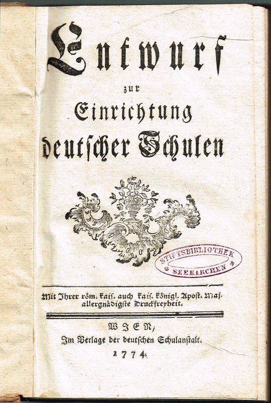 Nicht in Holzmann-Bohatta. - Anonym erschienener Beitrag zur Reform des Schulwesens unter Maria Theresia, die mit der am 6. Dezember 1774 erlassenen "Allgemeine Schulordnung für die deutsche Normal-, Haupt- und Trivialschulen in sämtlichen Erbländern" das deutschsprachige Grund- und Sekundarschulwesen in der Habsburgermonarchie vereinheitlichte. Ausführlich behandelt werden unter anderem Unterrichtsgegenstände, Schulschriften, Methodik des Unterrichts sowie Schultypen und Schulpläne. Verfasser der im März 1774 abgeschlossenen Schrift könnte der ehemalige Benediktinerpater Abbé Leopold Gruber (1740-1810/11) sein, der in diesem Jahr Lehrer für natürliche Sittlichkeit und Religion an den Wiener Normalschulen wurde. Verlegt wurde das Werk im ehemaligen Jesuitenkloster St. Anna in der Wiener Innenstadt, das nach der 1773 erfolgten Aufhebung des Ordens zum Schulgebäude umgestaltet wurde und unter anderem die Normalschule von St. Stephan beherbergte. - Sehr selten, in der Österreichischen Nationalbibliothek nur in Fotokopie vorhanden.