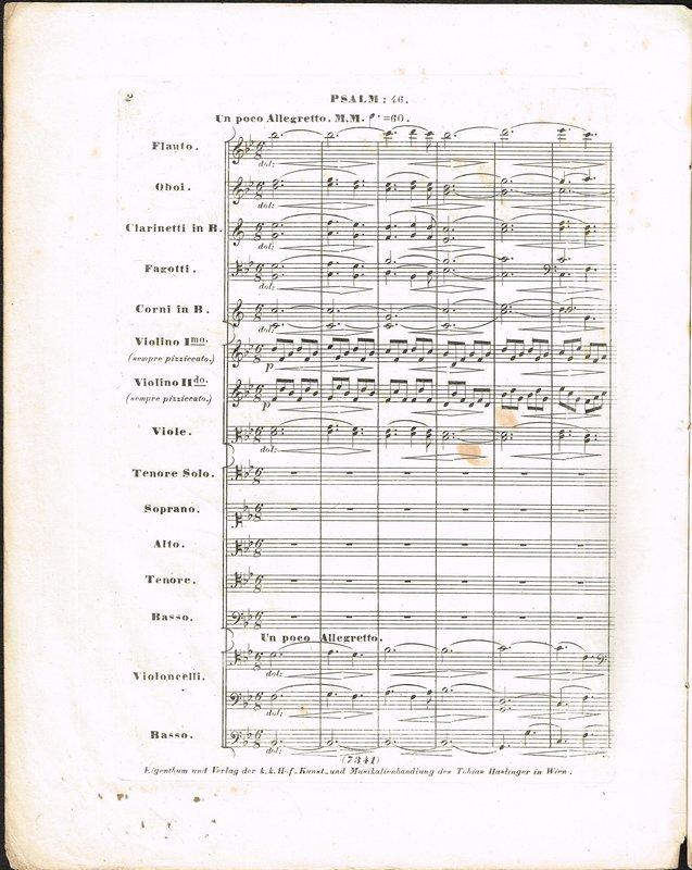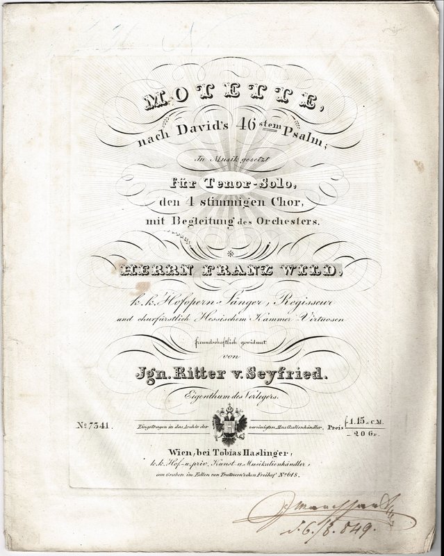Motette, nach David's 46stem Psalm; In Musik gesetzt für Tenor-Solo, den 4stimmigen Chor, mit Begleitung des Orchesters. Wien, Tobias Haslinger, [1838], Verlags-Nr. 7341. In-4; 19 pp, davon 1 Seite gestochener Titel (zugleich vorderer Umschlag) und 18 Seiten gestochene Noten; orig. Fadenheftung; etwas abgegriffen und stockfleckig (die letzte Seite stärker), alte Vermerke auf Titelblatt. - Vollständige Partitur mit unterlegtem lateinischem und deutschem Text.