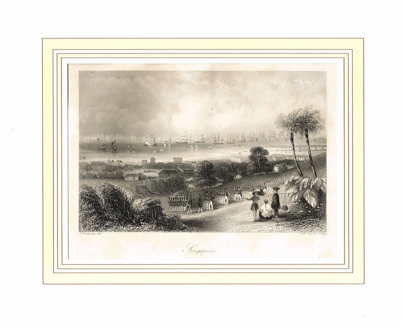 "Singapore." Stahlstich von Albert Henry Payne nach C. Graham aus Payne's Universum Bd. 4, London und Leipzig 1845, 11 x 16 cm. - Ansicht von einer Anhöhe aus. Im Vordergrund Einheimische in chinesischer Tracht und marschierende britische Soldaten, hinten das Meer mit zahlreichen Schiffen. - Etwas gebräunt.