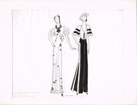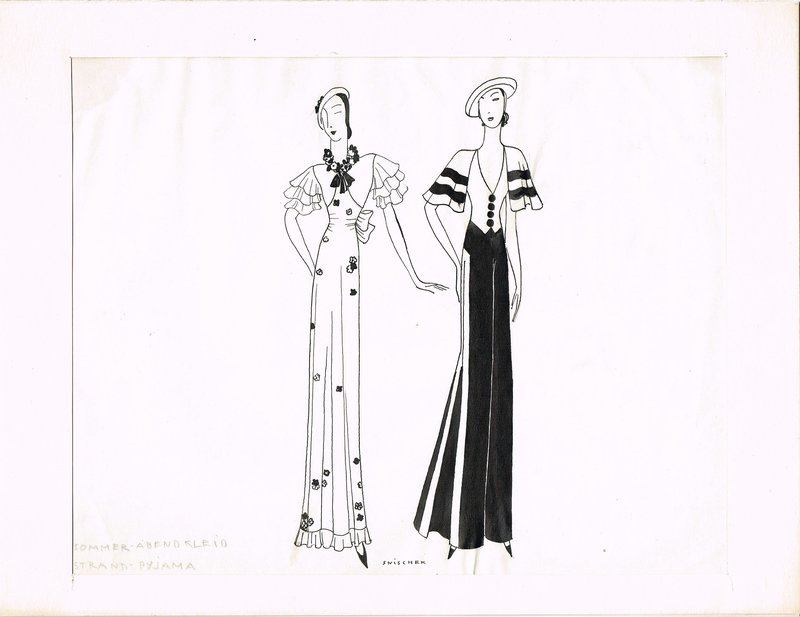 Zwei Modeblätter. 1. Junge Frau in rosa Kleid mit schwarzer Schleife und Flanierschirm. Farbige Kreidezeichnung, signiert und datiert 1915, Blattgröße 38 x 24 cm; etwas gebräunt und fleckig, die Signatur im Unterrand gefaltet unter zeitgenössischem Passepartout. 2. "Sommer-Abendkleid / Strand-Pyjama". Signierte Zeichnung mit Tuschestift, um 1925, Blattgröße 23 x 29 cm; unter zeitgenössischem Passepartout, leichte Montagespuren.