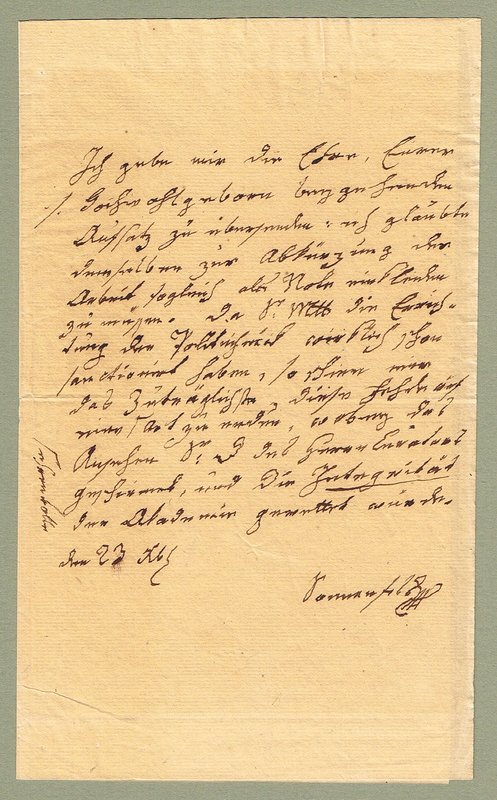 Eigenhändiger Brief mit Unterschrift, 3/4 Seite auf Doppelblatt, in-8, (Wien), 23. 12. (um 1810/1815). - An einen unbekannten Empfänger betreffend einen Streit rund um die Gründung des Wiener Polytechnikums, den Vorläufer der heutigen Technischen Universität. "Ich gebe mir die Ehre, Euer Hochwohlgeborn beygehenden Aufsatz zu übersenden: ich glaubte demselben zur Abkürzung der Arbeit sogleich als Note einkleiden zu müssen. Da S[eine] M[ajes]t[ä]t die Errichtung der Politechnik wirklich schon sanktionirt haben, so schien mir das Zuträglichste, diese Fehde auf eine ehrenvolle Art zu enden, wobey das Ansehen S[eine]r D[urchlaucht] des Herrn Curators geschirmet, und die Integrität der Akademie gerettet würde. Den 23 Xbr. Sonnenfels". Ohne die erwähnte Beilage. - In etwas zittriger Altersschrift auf dünnem Papier geschrieben, gebräunt und lichtrandig.