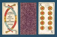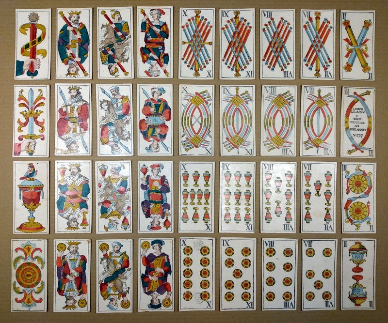 Trappolaspiel mit italienischen Farben bei J. Glanz, Wien um 1856, komplett mit 36 Karten. Schablonenkolorierte und eiweißgehöhte Lithographien, Rückseite unregelmäßig violett strukturiert, 121 x 60 mm. Mit Adresse "Niederlage am Kohlmarkt No. 279" auf Münze X und Firmenstempel "Glanz Joseph Wien 1856" sowie Steuerstempel zu 10 Kreuzern auf Schwert II. - Mäßig bespielt, vereinzelt gering fleckig; insgesamt sehr gut erhalten, dekorativ und selten. *** Trappola deck using Italian suits, complete with 36 cards, produced around 1856 in Vienna by card manufacturer J. Glanz. Trappola is a trick-taking card game with origins in Italy. It is known since the 16th century and was popular until the first half of the 20th century. The present deck features stencil-colored lithographs, an irregular purple pattern on the reverse side, the company imprint as well as a tax stamp (on swords II) and address (on coins X). Occasionally slightly stained but generally well-preserved, decorative and rare.