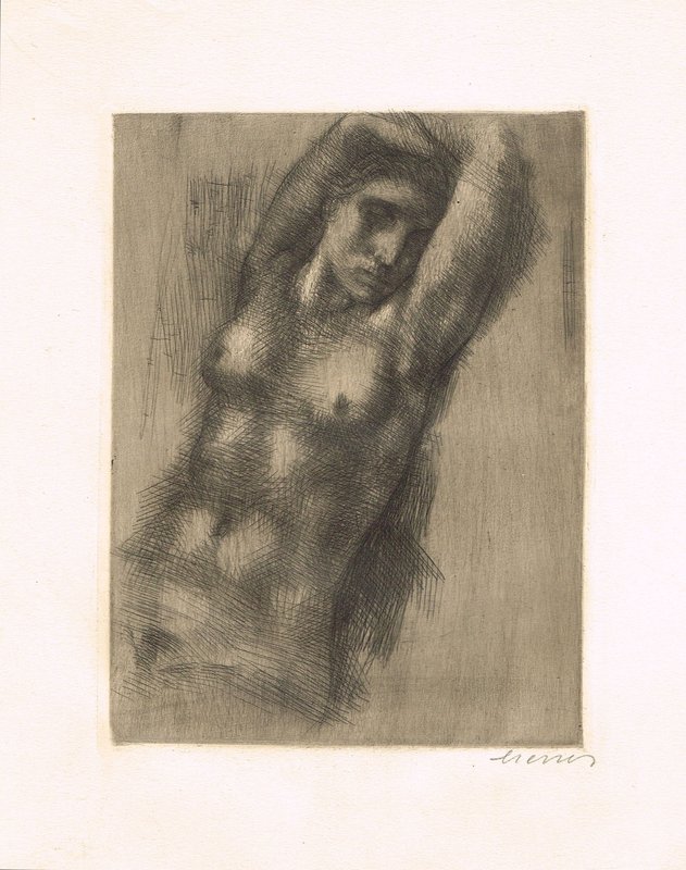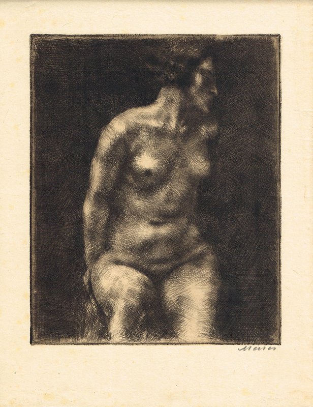 Sitzender weiblicher Akt (Kniestück). Signierte Radierung auf Japanpapier (1925), Bildformat 26 x 21 cm, Blattgröße 35 x 26,5 cm. - Dazu: Weiblicher Akt mit erhobenen Armen. Signierte Radierung auf Velin, Bildformat 17 x 12,5 cm, Blattgröße 28 x 22 cm (kleiner Eckabriss).