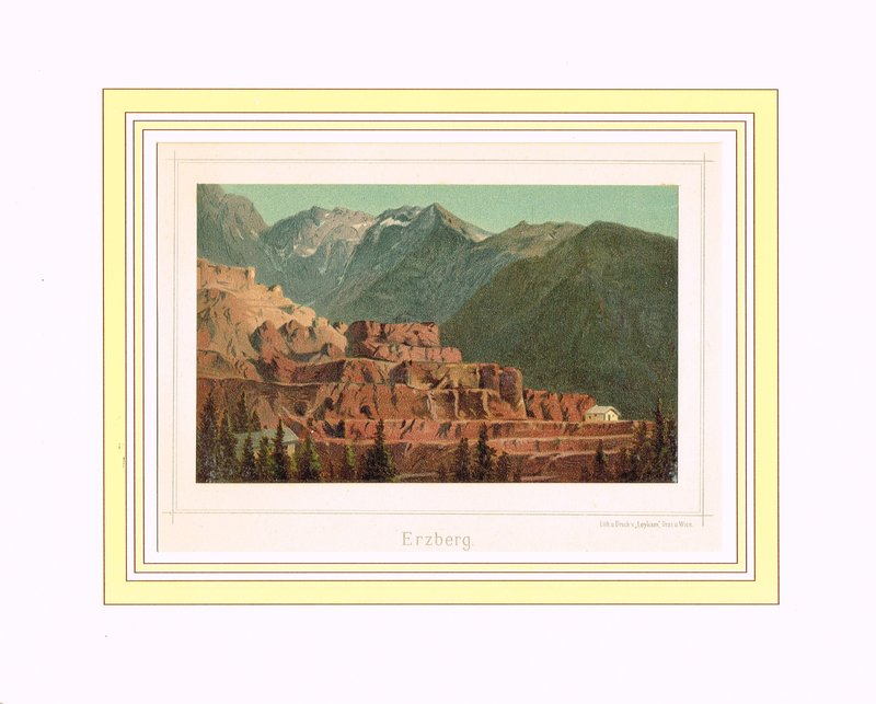 "Erzberg." Chromolithographie aus August Gerasch, Die österreichische Gebirgswelt, Graz, Leykam, 1887-94, 9,5 x 15 cm. - Teilansicht des stufenförmig abgebauten Gebirgsstocks, dahinter der Hauptkamm der Eisenerzer Alpen mit dem Wildfeld.