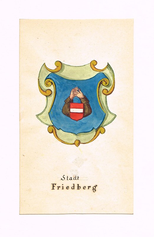 "Stadt Friedberg". Aquarellierte Wappenzeichnung von Vincenz Robert Widimsky, um 1860, Blattgröße 19 x 11 cm. - Bindenschild zwischen zwei sparrenweise ineinander gelegten Händen. - Im Schriftbereich geringfügig fleckig, am unteren Blattrand stärker (nicht störend).