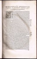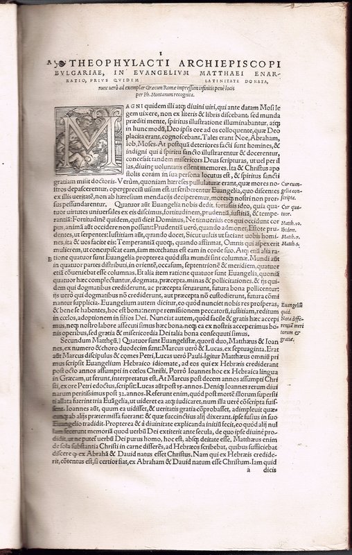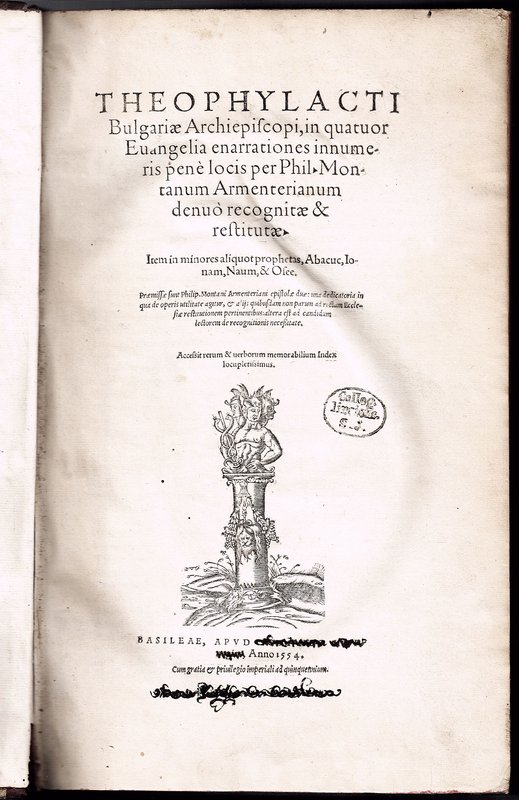 VD16 B 4619; zur Druckermarke (Hermes triceps) siehe Grimm, Druckersignete 210 f. - Kommentare zu den vier Evangelien, den Paulusbriefen und einigen Prophetenbüchern des Alten Testaments. Der aus Griechenland stammende Autor (auch Theophylakt von Bulgarien, um 1055 - 1126) wirkte in Konstantinopel als Geistlicher und Erzieher für das Kaiserhaus, ging 1078 als Erzbischof von Ohrid nach Bulgarien und leitete dort mit Umsicht und Engagement die bulgarische Kirche; er wird In den orthodoxen Kirchen von Serbien, Bulgarien, Griechenland und Russland als Heiliger verehrt. Seine Bibelkommentare "basieren auf den Lehren von Johannes Chrysostomos, jedoch behaupten sie ihren Platz in der exegetischen Literatur aufgrund ihrer Treffsicherheit, Nüchternheit, Genauigkeit und Ausgewogenheit" (Wikipedia). Die vorliegende lateinische Ausgabe besorgte der aus Flandern stammende Humanist Philippus Montanus (1498-1576), ein Schüler des Erasmus von Rotterdam, auf der Grundlage der 1542 in Rom erschienenen griechischen Edition.
