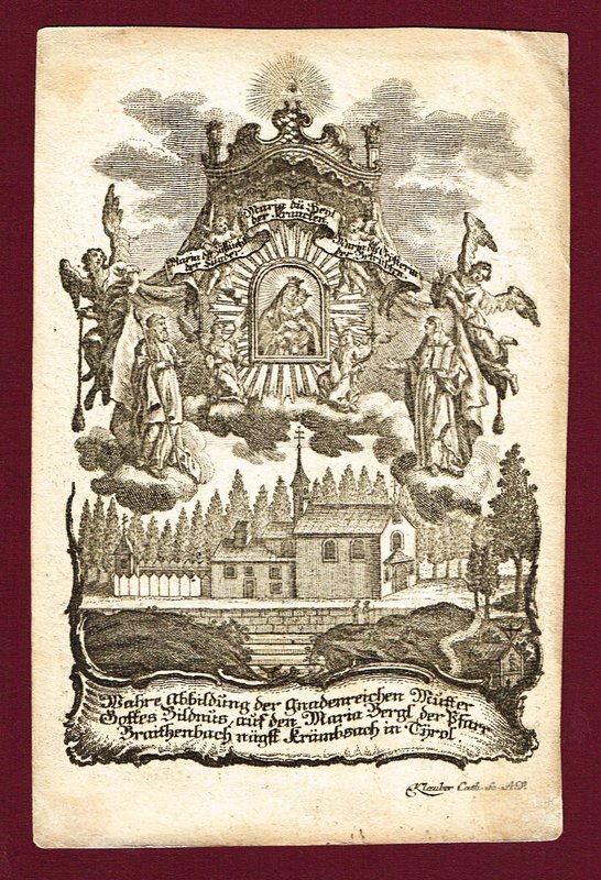 "Wahre Abbildung der Gnadenreichen Mutter Gottes Bildnus, auf den Maria Bergl der Pfarr Braithenbach nägst Krämbsach in Tyrol." Kupferstich-Andachtsbild bei Johann Baptist und Joseph Sebastian Klauber, Augsburg um 1750, Blattgröße 16 x 10,5 cm. - Die 1689 von einem Karmeliter namens Hilari gegründete Kapelle mit Eremitage auf einer Anhöhe im Nordwesten von Kramsach (das damals noch zur Pfarre Breitenbach am Inn gehörte), darüber Gnadenbild auf Wolken zwischen den Heiligen Joachim und Anna. - Geringfügige Randmängel, Ecken mit Montagespuren, rückseitig Bleistifteintragungen von alter Hand.