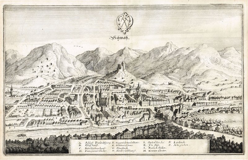 "Schwatz." Kupferstich aus Matthäus Merian, Topographia Provinciarum Austriacarum, Frankfurt 1649, 21 x 34 cm. - Die alte Bergwerksstadt am Inn mit Schloss Freundsberg; im Himmel Wappen, unten Bildlegende. - Leicht gebräunt, geglättete Mittelfalte.