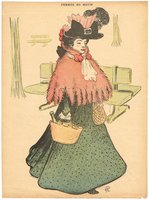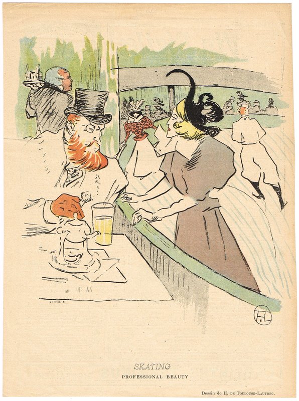 "Skating / Professional Beauty". Farblithographie von Garnier nach Toulouse-Lautrec aus der Zeitschrift "Le Rire" vom 11. 6. 1896 (No. 62), im Stein monogrammiert THL, Blattgröße 29 x 22 cm; rechts etwas ungleichmäßig beschnitten, Rückseite mit Annoncen bedruckt. - Dazu als Beigabe: "Femmes du Matin / La Belle Juive va aux provisions". Farblithographie von Ruckert nach Hermann-Paul aus derselben Zeitschrift vom 23. 5. 1896 (Nr. 81); unten hart beschnitten (Verlust der Beschriftung).