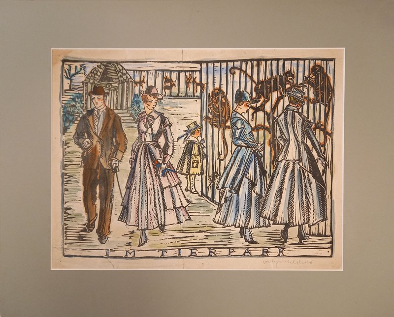 "Im Tierpark". Handkolorierter Holzschnitt auf Japanpapier, (1916), 27 x 37 cm, rechts unten von der Künstlerin mit Bleistift signiert. - Etwas angeschmutzt und stellenweise gering fleckig, im Rand knittrig, mehrere teilweise bis ins Bild reichende restaurierte Randrisse; trotz der Mängel insgesamt attraktiv und sehr selten.