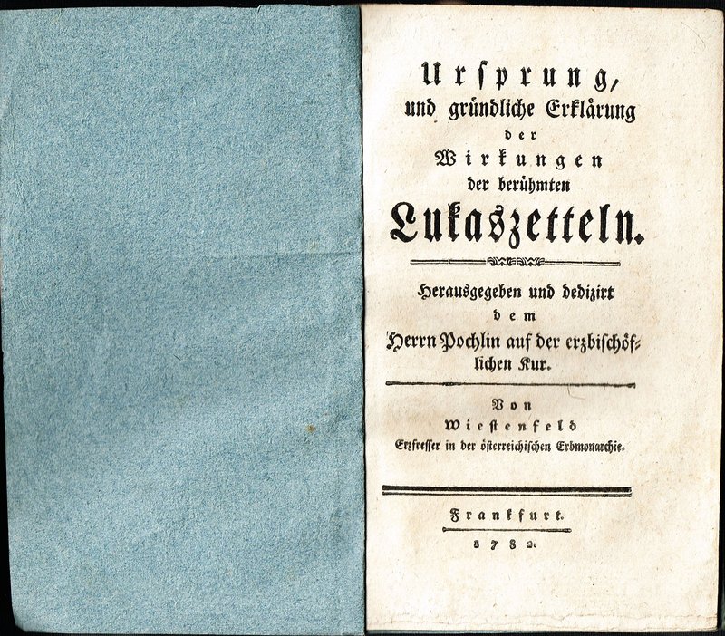 Ursprung, und gründliche Erklärung der Wirkungen der berühmten Lukaszetteln. Herausgegeben und dedizirt dem Herrn Pochlin auf der Erzbischöflichen Kur. Frankfurt [tatsächlich wohl Wien], 1782. Kl-8; 13 pp mit Kopfleisten und einer Vignette; Interimsbroschur mit Rotschnitt.