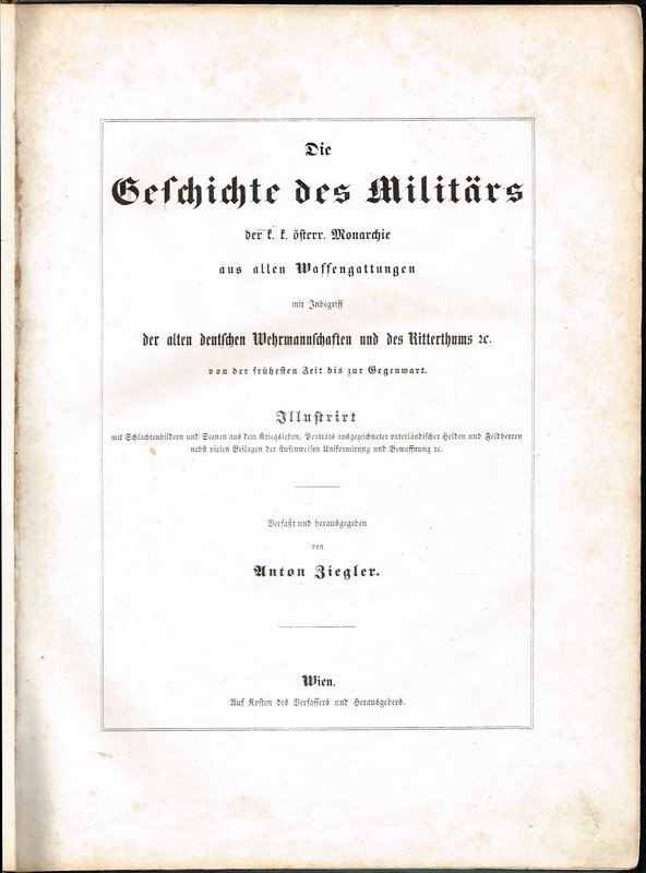 Wurzbach 60, 46; nicht in De Ridder, Hiler, Lipperheide und Colas. - Das heute ziemlich kurios anmutende militär- und uniformgeschichtliche Werk trägt die unverkennbare Handschrift seines etwas zwielichtigen Autors und Herausgebers, des Wiener Schriftstellers und Künstlers Anton Ziegler (1793-1869), der unter anderem mehrere volkstümliche Kompilationen zur vaterländischen Geschichte verfasste. "Alle die vorgenannten Werke scheinen im Selbstverlag herausgekommen und Ziegler mit denselben, um sie an Mann zu bringen, in Person hausiren gegangen zu sein. In den Buchhandlungen waren sie nicht zu haben und, da sie nur für die bestimmte Anzahl Abnehmer in einer beschränkten Anzahl Exemplaren gedruckt wurden, auch bald vergriffen ..." (Wurzbach). Die eiweißgehöhten und meist mit Seidenpapiervorsätzen versehenen Lithographien stammen - soweit sie im Stein signiert sind - teils von Ziegler selbst, teils von Vinzenz Katzler (1823-1882).