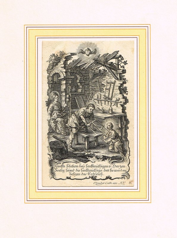 "... Seelig seynd die sanftmüthige: dann sie werden besizen das Erdreich." Kupferstich aus einem Werk bei Johann Baptist und Joseph Sebastian Klauber, Augsburg um 1750, Blattgröße 15 x 9 cm. - Der Hl. Josef mit seiner Familie in der Werkstatt. Illustration zu einem Satz aus der Bergpredigt (Mt 5,5), der über dem Bild nochmals in lateinischer Fassung steht. - Kleine Randmängel, leicht fleckig.