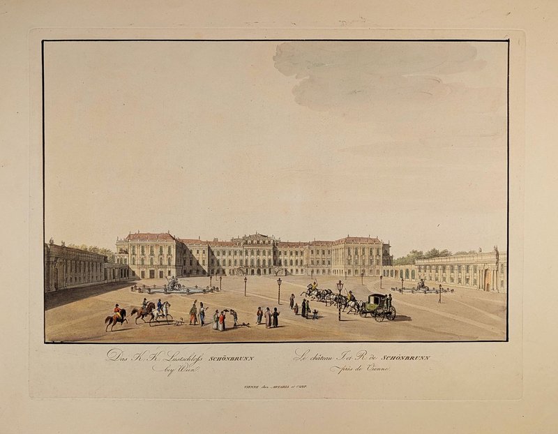 "Das K: K: Lustschloß Schönbrunn bey Wien". Altkolorierte Umrissradierung bei Artaria, Wien um 1820, 26 x 40 cm. - Das Schloss von der Eingangsseite mit belebtem Vorplatz.