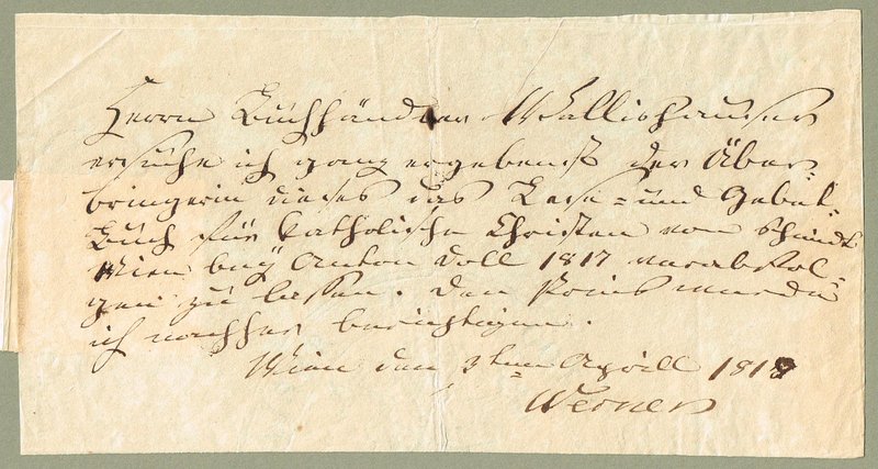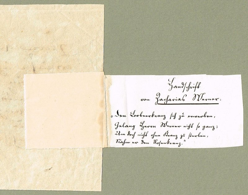 Eigenhändiges Schriftstück mit Unterschrift ("Werner"), Wien, 3. 4. 1818 (korrigiert aus "1817"), 1 Seite, quer-8. - "Herrn Buchhändler Wallishauser ersuche ich ganz ergebenst der Überbringerin dieses das Lese- und Gebet-Buch für katholische Christen von Schmidt Wien bey Anton Doll 1817 vorabfolgen zu lassen. Den Preis werde ich nachher berichtigen." Angeheftet eine satirische Notiz von der Hand des Juristen und ersten Goethe-Bibliographen Alfred Nicolovius (1806-1890): "Handschrift von Zacharias Werner. / 'Den Lorbeerkranz sich zu erwerben, / Gelang Herrn Werner nicht so ganz; / Um doch nicht ohne Kranz zu sterben, / Nahm er den Rosenkranz.'" (Abwandlung eines Spottgedichtes auf den Dichter und Übersetzer Friedrich Leopold Graf zu Stolberg). - Falt- und leichte Knitterspuren.
