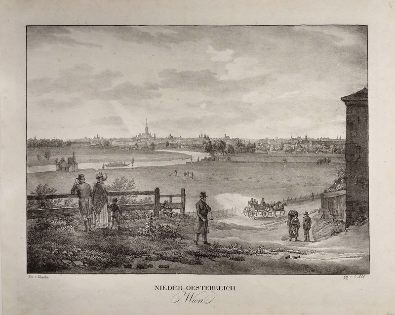 "Nieder-Oesterreich / Wien." Lithographie nach Jakob Alt aus Adolf Kunike, Donau-Ansichten, Wien 1826, 26 x 35 cm. - Blick von der Rossau entlang des Donaukanals auf die Stadt und ihre nördlichen Vorstädte. Links der Augarten, rechts das Allgemeine Krankenhaus. Schöne, seltene Gesamtansicht.