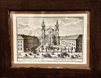"St: Andree." Kupferstich aus Matthäus Merian, Topographia Provinciarum Austriacarum, Frankfurt 1649, 20 x 32,5 cm. - Gesamtansicht mit Pfarrkirche St. Andrä, Lorettokirche, Bischofsresidenz und Rathaus. - Geglätteter Mittelbug, kaum sichtbarer hinterlegter Einriss in linker unterer Bildecke.