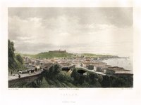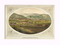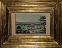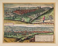 "Eisenstadium vulgo Eisnstat, in ultimis finibus Austriæ Inferioris civitas. - Mannersdorf." Altkolorierter Kupferstich von Georg nach Jakob Hoefnagel 1617 aus Georg Braun & Franz Hogenberg, Civitates Orbis Terrarum, Köln 1572-1617, 39 x 47 cm. - Das horizontal geteilte Gesamtblatt in kräftigem Druck und kräftigem Kolorit. Unter der Ansicht von Eisenstadt Blick vom Leithagebirge über Mannersdorf und das Wiener Becken bis zum Wienerwald; Legendenkartusche mit Erwähnung der Mannersdorfer Thermalquelle. - Übliche Mittelfalte sowie vertikale Quetschfalte, das alte Kolorit gelegentlich etwas unsauber, insgesamt gutes Exemplar.