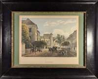 "Schönbrunn. Die Girafe in der innren Ansicht der Loge." Altkolorierter Kupferstich mit Aquatinta (wohl von Eduard Gurk) aus "Wiens Umgebungen" bei Tranquillo Mollo, Wien um 1828, 11 x 15 cm. - Die im August 1828 als Geschenk des ägyptischen Vizekönigs Mehmed Ali an Kaiser Franz I. eingetroffene erste Giraffe in der Wiener Menagerie mit ihrem arabischen Wärter Hadschi Ali Sciobari. - In der Bordüre und im weißen Rand etwas fleckig, sonst wohlerhalten und farbfrisch. Von größter Seltenheit.