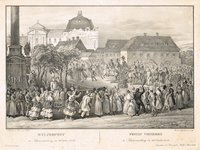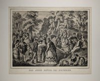 "Huldigung der Herzoge von Kärnthen im Mittelalter." Federlithographie von P. Röhrich bei Carl Wilhelm Medau aus "Erinnerungen an merkwürdige Gegenstände und Begebenheiten ..." 24. Jg., 1844, ca. 15 x 21 cm. - Phantasievolle Darstellung vom Ritual der Kärntner Herzogseinsetzung im Blachfeld bei Karnburg. Der hier nur ungenau wiedergegebene "Fürstenstein" (nicht zu verwechseln mit dem Kärntner Herzogstuhl) stammt aus der römischen Stadt Virunum auf dem Zollfeld und befindet sich heute im Klagenfurter Landhaus. Zugehöriger Text beiliegend.