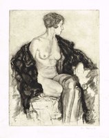 Weiblicher Akt. Radierung auf Japanpapier, um 1927, rechts unter der Darstellung mit Bleistift signiert, Bildformat 26 x 21,5 cm, Blattgröße 34 x 25,5 cm. - Das Blatt erschien auf anderem Papier und mit typographischer Beschriftung auch in "Die Graphischen Künste" Jg. 50 (1927).