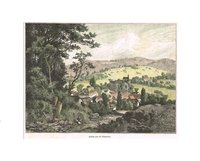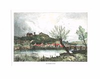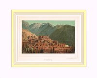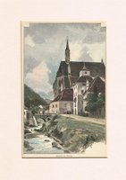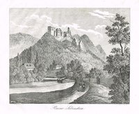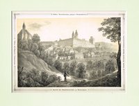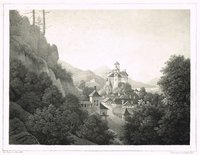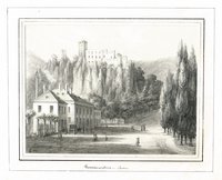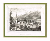 "Arnoldstein." Lithographie von Joseph Wagner aus "Ansichten aus Kärnten" bei Leon, Klagenfurt 1844, 22,5 x 30 cm. Malerischer Blick auf den Ort mit der Klosterburg des ehemaligen Benediktinerstiftes (1883 abgebrannt) und der Kreuzkapelle. - Knapprandig, unten angerändert.