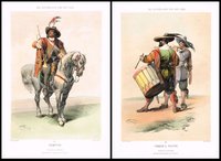 Trompeter, Flötenspieler und Trommler aus der Zeit des Dreißigjährigen Kriegs. Drei altkolorierte, im Stein signierte Tonlithographien von Franz Gerasch (1826-1906) aus "Das Oesterreichische Heer von 1620-1650" bei L. T. Neumann, Wien um 1854, je 24 x 17 cm. - Einzelne unbedeutende Rand- und Eckmängel, rückseitig Montagespuren.