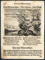 "Das Murmelthier / Mus alpinus, Lesnj Myss." Kupferstich mit Gedicht auf ganzer Buchseite aus Johann Christoph Sartorius, Neues Thier-Buch, Oder: Merckwürdige Beschreibung Der Thieren und Vögeln ..., Prag 1718, Bildformat 8 x 11 cm, Blattgröße 18 x 13 cm. - Etwas fleckig und feuchtrandig.