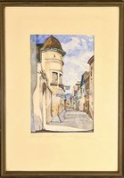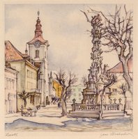"Rust". Kolorierte Radierung von Gerson Kovacs (1941-2021), 11 x 9 cm. - Der Hauptplatz mit der katholischen Pfarrkirche.