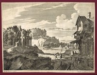 Flusslandschaft mit Ruinen und Stadt im Hintergrund. Radierung bei Pierre Drevet, Paris um 1700, 23 x 31,5 cm. - Mit schmalem Rändchen um die Bildkante. Leichte Altersspuren, rückseitig Besitzerstempel. - Dazu ein kleineres radiertes Landschaftsblatt nach Perelle von Johann Christoph Hafner bei Jeremias Wolff, Augsburg um 1700, 9 x 19 cm.