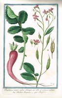 "Raphanus minor ...". Altkolorierter Kupferstich mit lateinischer, italienischer und französischer Beschriftung aus Giorgio Bonelli, Hortus Romanus, Rom 1772-1793, Bildformat 34 x 22 cm, Blattgröße 55 x 39 cm. - Roter Garten-Rettich (Raphanus sativus). Breitrandiger Abzug. - Horizontale Quetschfalte, leicht fleckig.