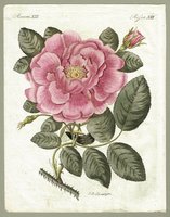 "Die grosse dunkle Damascener-Rose." Altkolorierter Kupferstich von Franz Xaver Schmuzer aus F. J. Bertuch, Bilderbuch zum Nutzen und Vergnügen der Jugend, Wien um 1810, Blattgröße 24,5 x 19 cm. - Geringfügig wellig. Mit zugehörigem Textblatt in Deutsch und Französisch.
