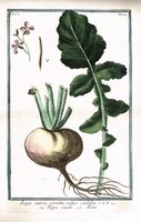 "Rapa sativa ...". Altkolorierter Kupferstich mit lateinischer, italienischer und französischer Beschriftung aus Giorgio Bonelli, Hortus Romanus, Rom 1772-1793, Bildformat 34 x 22 cm, Blattgröße 55 x 39 cm. - Speiserübe (Brassica rapa). Breitrandiger Abzug. - Kaum sichtbare horizontale Quetschfalte.