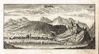 "Marckt Unt Schloß S. Paternion". Kupferstich von Andreas Trost nach Johann Weichard Valvasor aus J. W. Valvasor, Topographia Archiducatus Carinthiae, Laibach 1681, 12 x 21 cm. - Der Ort mit der Schlossanlage, im Vordergrund die Drau. - Nicht störende leichte Flecken im weißen Rand.