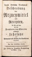 Herrn Hermann Boerhaaves Beschreibung der Arzneymittel und Recepten, die sich auf seine von dem Freyherrn van Swieten erläuterte Lehrsätze von Erkenntnis und Heilung der Krankheiten beziehen. Aus dem Lateinischen übersetzt. Wien, Krauß, 1773. Kl-8; Titel, 311, (1) pp mit einigen Vignetten; Lederband der Zeit mit Rückenvergoldung, Rückenschildchen, Buntpapiervorsätzen und Rotschnitt (berieben und bestoßen, hinterer Deckel fleckig); mäßige Gebrauchs- und Altersspuren, insgesamt ordentlich. - Eine herausgerissene Seite (17/18) durch Fotokopie ersetzt.