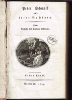 Peter Schmoll und seine Nachbarn. Vom Verfasser des Erasmus Schleicher. 2 Tle. in einem Band. Rudolstadt [recte Wien?], 1799. Kl-8; 1 Bl., 187 pp; 183 pp; 2 gestochene Titelvignetten; marmorierter Pappband der Zeit mit Rückenschildchen (berieben, Bindung etwas gelockert, ohne fliegende Vorsätze); Titelblätter dezent gestempelt, teilweise etwas stockfleckig oder feuchtrandig.