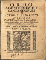 Ordo agendorum et cantandorum in actibus processionalibus. Pro F. F. Franciscanis strictioris Observantiae, in alma Provincia Austriae Deo famulantibus anno M.DC.LVI. accomodatus nunc novo examine revisius denuo vulgatus. Wien, Leopold Voigt, 1702 (Chronogramm). in-8; Titel mit Holzschnitt-Vignette (Hl. Franziskus empfängt die Wundmale Christi), 74 pp mit zahlreichen Gesangsnoten (Quadratnoten auf vier Linien mit Text) und Schlussvignette; schlichter Pergamentband der Zeit (fleckig, kleine Risse und Fehlstellen, Bindung gelockert); teilweise mäßig gebräunt, vereinzelt stärker fleckig, Titel und letzte Seite geringfügig bekritzelt, Vorsätze stärker.