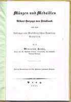Münzen und Medaillen Albert Herzogs von Friedland, nebst einem Anhange von Waldsteinischen Familien-Medaillen. (Separatabdruck aus den Verhandlungen der Gesellschaft des vaterländischen Museums in Böhmen 1840.) Prag, 1841. In-8; Titel, 15 pp, 9 lithogr. Tafeln; schlichter priv. Leinenband (fleckig, Rücken schadhaft); vereinzelt etwas stockfleckig, insgesamt gut erhalten.