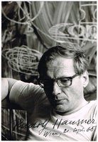Fotoporträt-Postkarte (Aufnahme Walter Reiser, Stuttgart) mit eigenhändigem Namenszug auf der Bildseite, Wien, 21. 9. 1965. Eine Ecke mit kleiner Knickspur, rückseitig Montagereste. - Beiliegend eine farbige Kunstpostkarte von Wolfgang Hutter (1928-2014) mit Wiedergabe seines Werks "Das grüne Bild", am oberen Rand eigenhändig signiert.