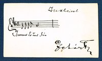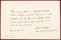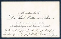 Gedruckte Visitenkarte als österreichischer Generalkonsul in Leipzig mit eigenhändigen 6 Zeilen (in 3. Person) und Unterschrift, Leipzig, 27. 10. 1879. "... bedauert daß ein katarrhalisches Leiden ihm nicht gestattet der nächsten Eröffnungssitzung der Geographischen Gesellschaft beizuwohnen dessen wirkl. Mitglied zu sein, eben die Ehre zu haben hofft ... Scherzer".