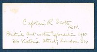 Eigenhändig beschriebene kleine Visitkarte (4 x 8 cm): "Captain R Scott / R[oyal] N[avy] / British Antarctic Expedition 1910 / 36 Victoria Street; London SW". - Leicht fleckig.