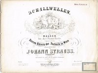 Schallwellen. Walzer für das Piano-Forte. Componirt und den Herren Hörern der Technik in Wien achtungsvoll gewidmet von Johann Strauss, Kapellmeister. 148tes Werk. Wien, Carl Haslinger, (1854), Platten-Nr. 11667. Quer-4; lithographierter Umschlag mit Titel, S. 3-10 gestochene Noten; Orig.-Broschur (Fadenheftung gelöst, kleine Bugläsuren); Titel gestempelt und mit kleinem Etikett, stellenweise geringfügig fleckig. - Beiliegend ein Programmblatt des Wiener Männer-Gesangvereines zu einem Konzert unter Mitwirkung der Strauss-Kapelle am 5. 9. 1861 in Hietzing (in-4; knittrig und fleckig).