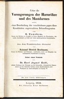Ueber die Verengerungen der Harnröhre und des Mastdarmes nebst einer Beurtheilung der verschiedenen Behandlungsarten ... Aus dem Französischen übersetzt von Raimund Dietrich Brachmann ... Nebst einer Vorrede von Dr. Karl August Kuhl. Leipzig, Kollmann, 1836. In-8; XX, 232 pp 3 lithographierte Falttafeln; marmorierter Pappband der Zeit mit Rückenschildchen. Leichte Altersspuren, insgesamt sehr gut erhalten.