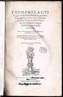 VD16 B 4619; zur Druckermarke (Hermes triceps) siehe Grimm, Druckersignete 210 f. - Kommentare zu den vier Evangelien, den Paulusbriefen und einigen Prophetenbüchern des Alten Testaments. Der aus Griechenland stammende Autor (auch Theophylakt von Bulgarien, um 1055 - 1126) wirkte in Konstantinopel als Geistlicher und Erzieher für das Kaiserhaus, ging 1078 als Erzbischof von Ohrid nach Bulgarien und leitete dort mit Umsicht und Engagement die bulgarische Kirche; er wird In den orthodoxen Kirchen von Serbien, Bulgarien, Griechenland und Russland als Heiliger verehrt. Seine Bibelkommentare "basieren auf den Lehren von Johannes Chrysostomos, jedoch behaupten sie ihren Platz in der exegetischen Literatur aufgrund ihrer Treffsicherheit, Nüchternheit, Genauigkeit und Ausgewogenheit" (Wikipedia). Die vorliegende lateinische Ausgabe besorgte der aus Flandern stammende Humanist Philippus Montanus (1498-1576), ein Schüler des Erasmus von Rotterdam, auf der Grundlage der 1542 in Rom erschienenen griechischen Edition. Weiterlesen