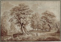 Baumlandschaft mit Menschen und Tieren. Lavierte Sepia-Pinselzeichnung über leichter Bleistiftskizze, stellenweise zart mit Deckfarbe gehöht, wohl spätes 18. Jahrhundert, 22 x 40 cm. - Mit schmalem Rand um die mit schwarzer Tusche ausgezogene Bildkante. - Leichte Knicke an den Seitenrändern, rückseitig Spuren von Montage, eine Ecke dadurch geringfügig beschädigt.